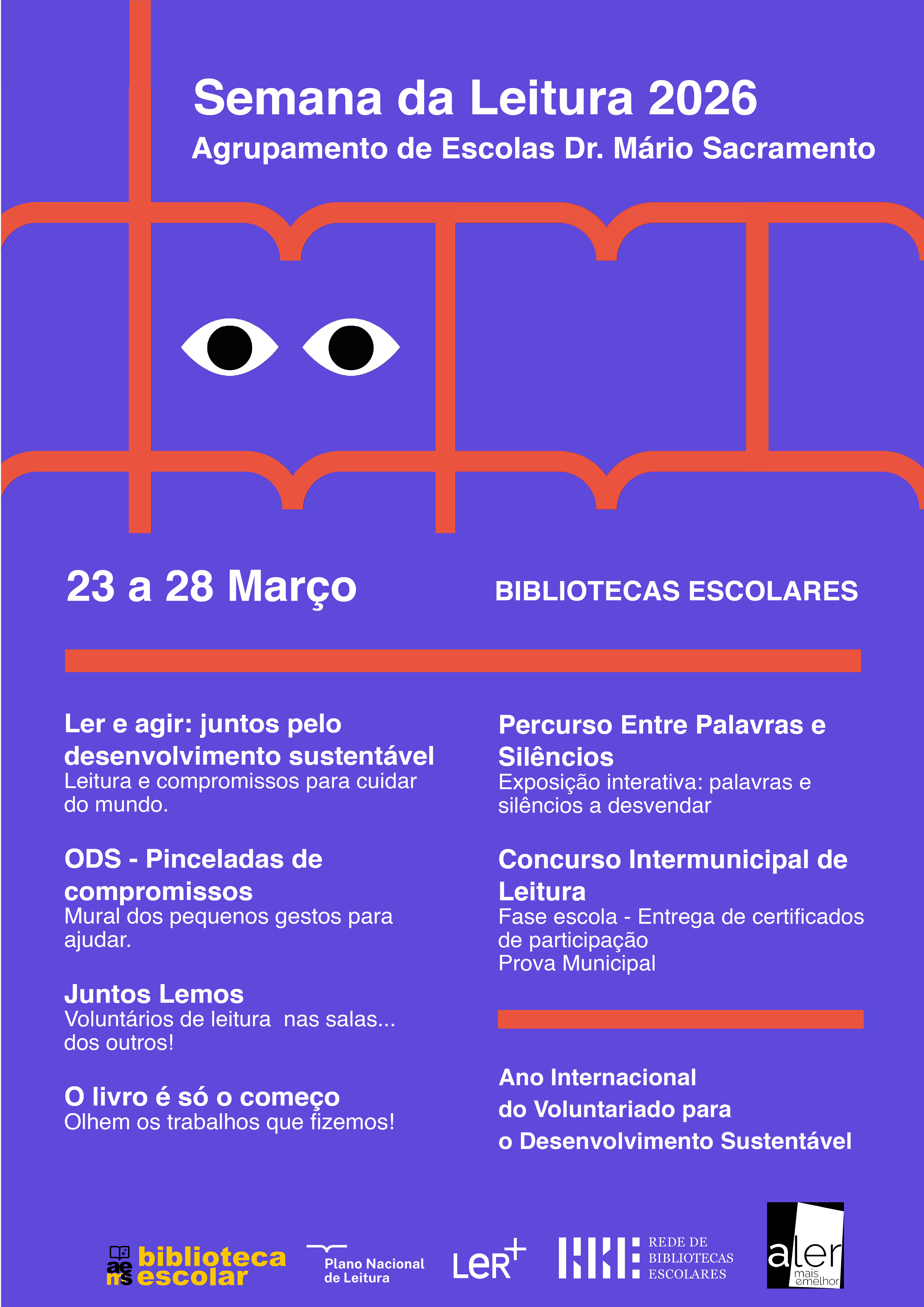 Entre os dias 23 e 28 de março, o Agrupamento comemora a Semana da Leitura, destinada a celebrar e incentivar o prazer de ler, com atividades que promovem a leitura e o encontro entre os livros e os seus leitores, nas bibliotecas escolares, em contexto de sala de aula e noutros espaços educativos. Sendo 2026 o Ano Internacional do Voluntariado para o Desenvolvimento Sustentável, as atividades centram-se, essencialmente, em temas diretamente ligados aos Objetivos de Desenvolvimento Sustentável (ODS), definidos pela Agenda 2030 das Nações Unidas, convidando os alunos a refletir e agir sobre questões como a saúde e o bem-estar, a inclusão e colaboração, o consumo responsável, a gestão sustentável da água e a proteção do ambiente.